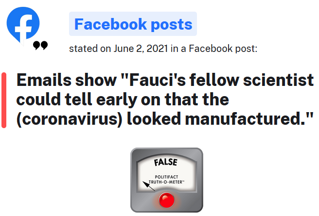 "Dr Fauci exposed for the fraud he is," said a June 2 Facebook post from the WTF Files. "Fauci's fellow scientist could tell early on that the (coronavirus) looked manufactured."