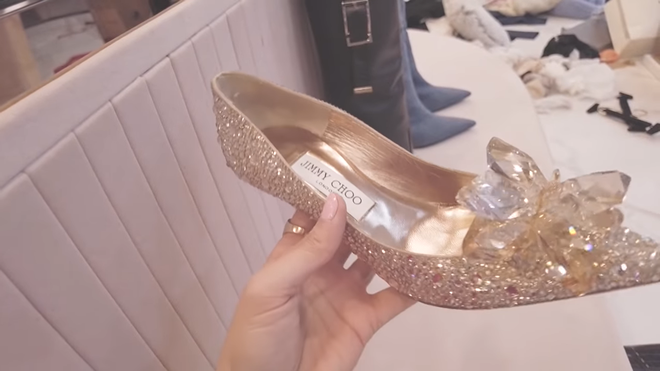 Sau khi lượn một vòng, Phương Thy Thu đã tiết lộ với khán giả đôi guốc đắt nhất của Ngọc Trinh. Đó là một đôi guốc lấy cảm hứng từ guốc thủy tinh của cô bé lọ lem, gắn pha lê, có giá lên tới 110 triệu đồng.