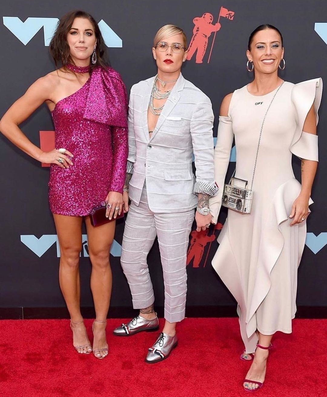 Váy sequin bất đối xứng nhấn bằng chi tiết nơ lớn ở cầu vai được Morgan (trái) lựa chọn khi tới VMAs 2019. Ảnh: Instagram Alex Morgan.