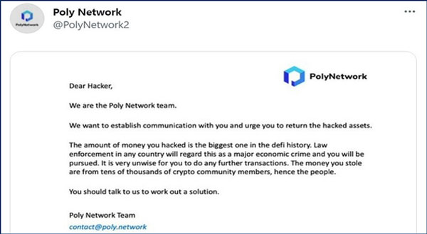 Mới đây, Poly Network đã đăng thông báo về vụ giao thức chuỗi chéo này bị hacker tấn công. Lấy đi hơn 600 triệu USD. Đồng thời kêu gọi các thợ đào dừng giao dịch với các token được chuyển đến ví điện tử của hacker.