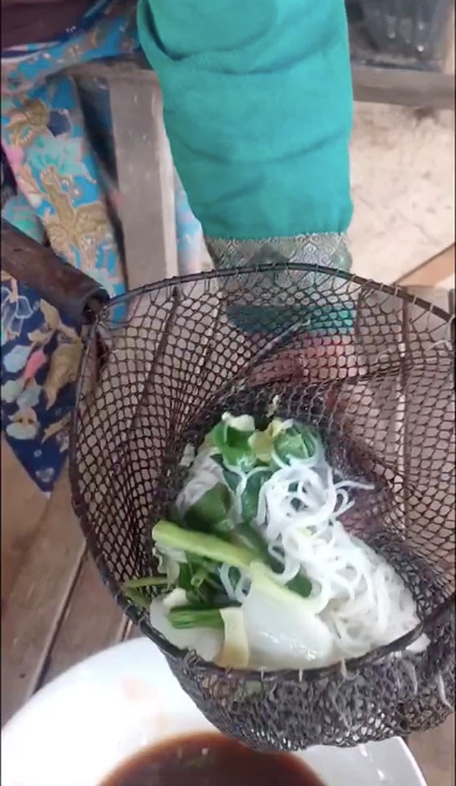 Theo đó, người phụ nữ trong video đựng hỗn hợp gồm bún và rau cải trong một chiếc vợt bằng lưới (như lưới đánh cá). Sau đó, bà ta tiếp tục đổ nó vào tô nước súp có màu nâu đen đặc trưng.