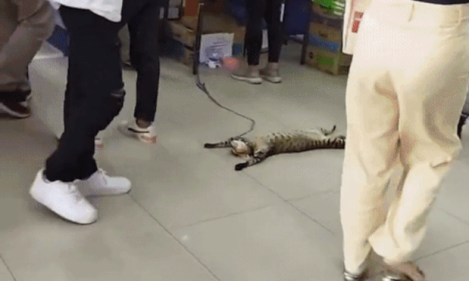 Mèo siêu lười nằm 'ăn vạ' trong siêu thị. Cửa hàng bật điều ḥa mát quá nên con mèo nằm ngửa bụng lên trời không thèm bận tâm đến nhiều người đang quay phim, chụp ảnh ḿnh.