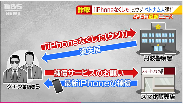 Theo cảnh sát, vào tháng một, có một người Việt Nam tên Cảnh đã đến Sở cảnh sát Tamba, tỉnh Hyogo để trình báo về việc bị đánh cắp điện thoại. Mục đích của hành động này là để được phía cảnh sát cung cấp giấy chứng nhận mất đồ.Sau khi có được giấy chứng nhận, đối tượng đến cửa hàng điện thoại của nhà mạng để được đổi chiếc điện thoại mới miễn phí. Chiếc máy bị báo mất là sản phẩm iPhone 12 Pro Max có giá bán tại Nhật là 156.000 yên, tương đương 32 triệu đồng.