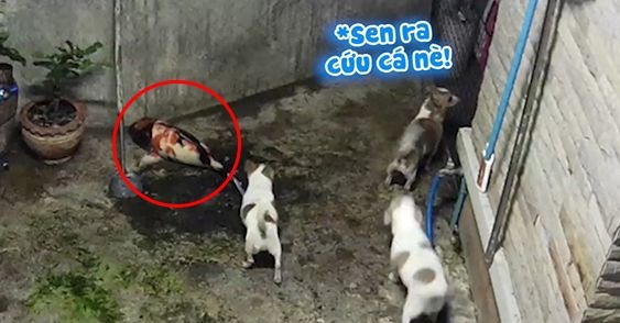 Thấy con cá nhảy nằm thoi thóp dưới đất, bầy chó nhanh chóng sủa to để báo hiệu cho chủ nhân.