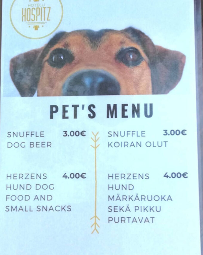 Tại Phần Lan, nhiều nhà hàng, quán cà phê có cả menu phục vụ thú cưng của thực khách. Vào mùa hè, các nhà hàng cung cấp đồ ăn cho chó ở bên ngoài hiên. Chúng được phát nước miễn phí và có cả thực đơn phải trả tiền gồm nước uống, đồ ăn nhẹ và thậm chí là đồ tráng miệng. Ảnh: Instagram