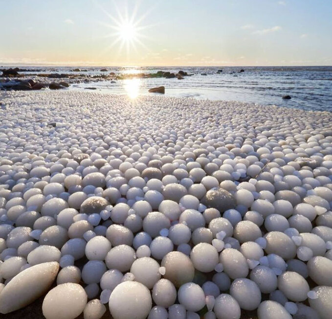 Trên ảnh là những quả trứng băng xuất hiện trên một bãi biển Phần Lan. Đây là một hiện tượng hiếm gặp và rất nhiều du khách thích thú khi nhìn thấy băng có hình quả trứng này. Ảnh: Rismatti/Instagram