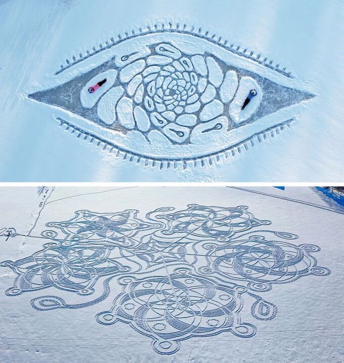 Vào mùa đông, khi băng tuyết bao phủ kín các mặt hồ, bạn có thể thoải mái thể hiện sự sáng tạo của mình bằng cách tạo nên các bức vẽ bằng tuyết. Ảnh: Twitter