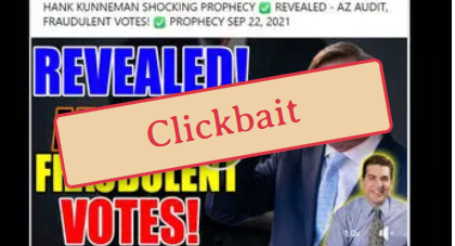 Did Hank Kunneman reveal a shocking prophecy that had to do with the Arizona audit or fraudulent votes? No, that's not true: This video's headline is an example of a clickbait tactic of a spam network that deceptively captures the attention of an American audience with headlines that bear little relation to the content of the video promoted.