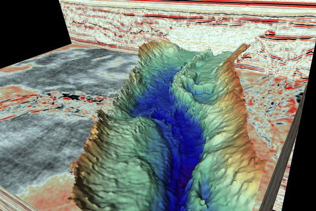 Phát hiện thung lũng và vách đá tuyệt đẹp ẩn dưới lòng Đại Tây Dương. Trong một thung lũng đường hầm dưới đáy Đại Tây Dương, các nhà khoa học đã phát hiện ra khối đá ngầm (một lớp trầm tích của một kênh nước tan hình thành bên dưới một tảng băng).