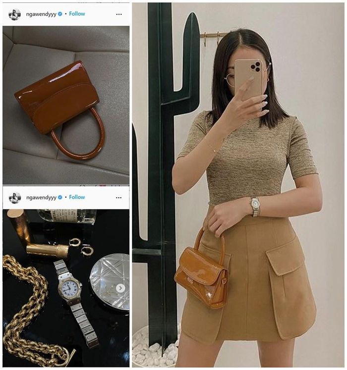 Tấm hình quy tụ đủ mọi sự xinh đẹp. Chiếc đồng hồ Cartier giá ngất ngưởng 200 triệu đồng và túi xách da bóng được cô mix tông xuyệt tông với set chân váy và áo thun đơn giản nhưng không kém nổi bật.