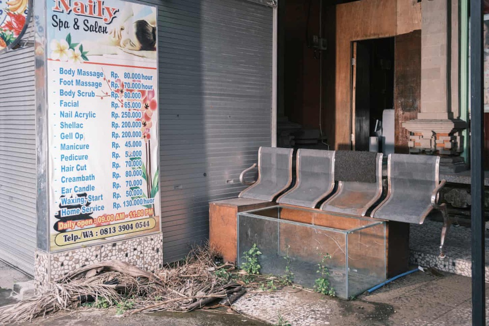 Cảnh tượng hiu hắt không phải tình trạng của riêng Jimbaran, mà nó xảy ra ở các danh thắng khác của Bali như Kuta, Ubud hay Sanur, theo Guardian. Trên các con phố có thời nhộn nhịp du khách, các cửa hàng, quán cà phê, nhà hàng đều đóng cửa. Ảnh: Guardian.