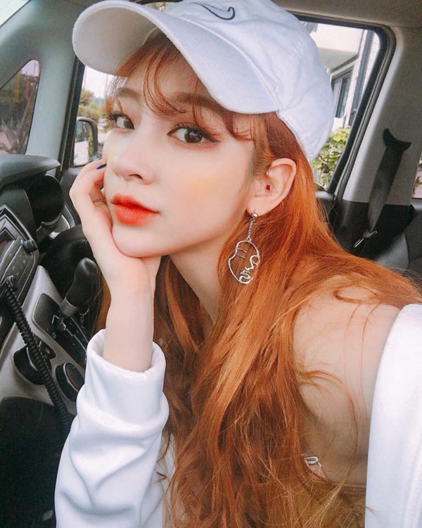 Tóc nhuộm cam đỏ với kiểu trang điểm cùng tone giúp chị em trông tươi tắn hơn rất nhiều.