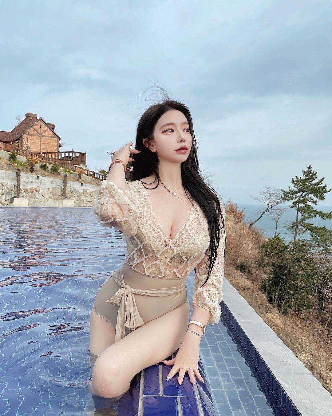 Người đẹp Hàn Quốc này chọn mặc bộ áo tắm màu nude có chi tiết áo may bằng vải ren xuyên thấu. Trang phục ướt nước càng tăng thêm vẻ quyến rũ.