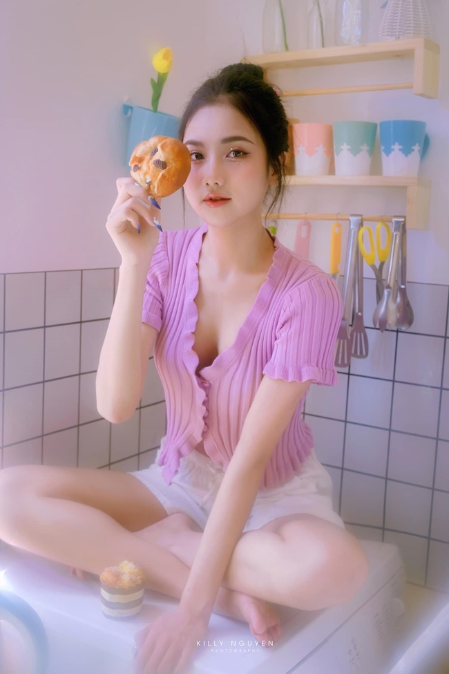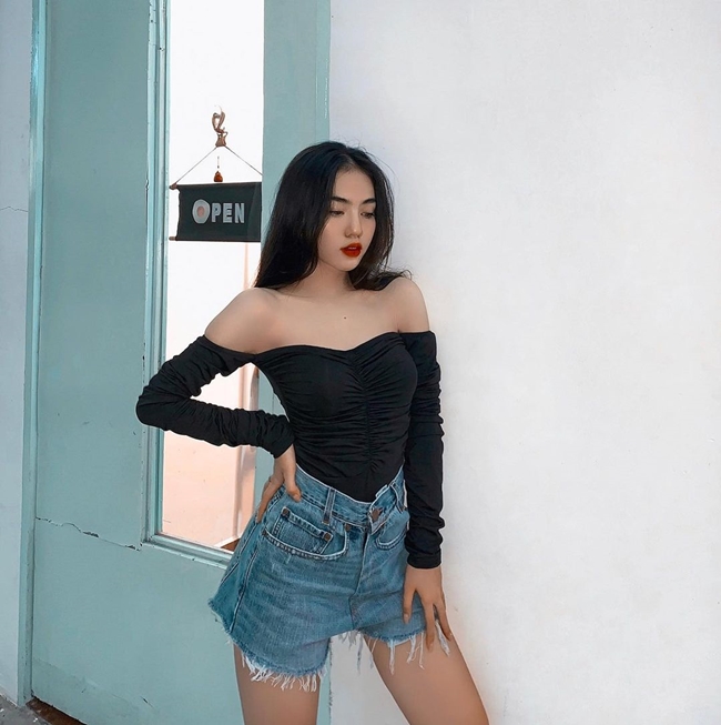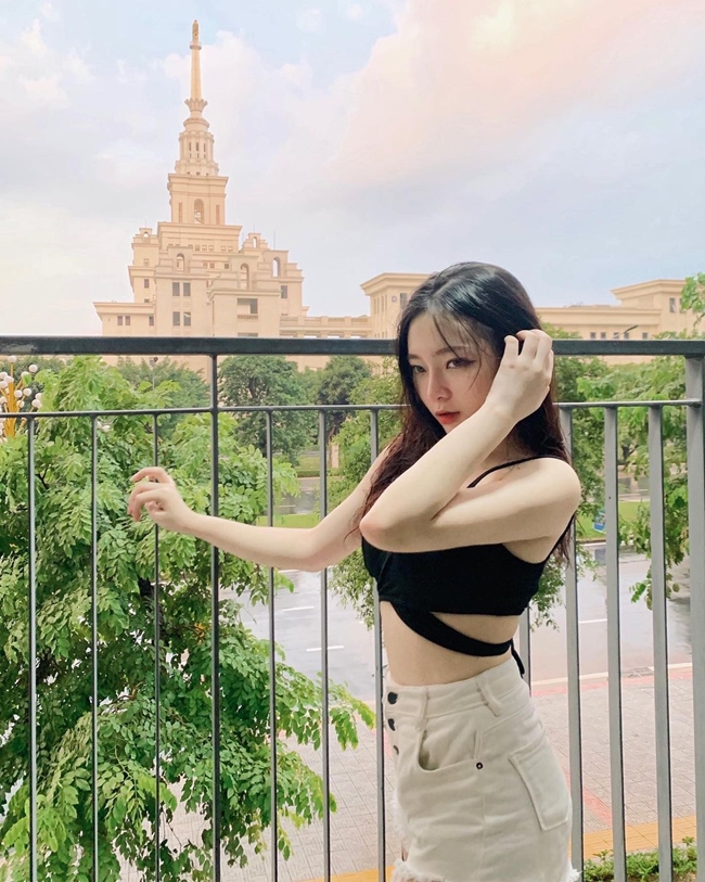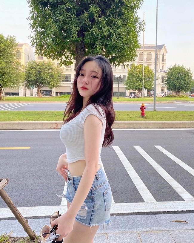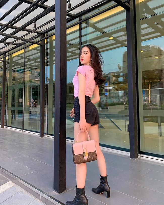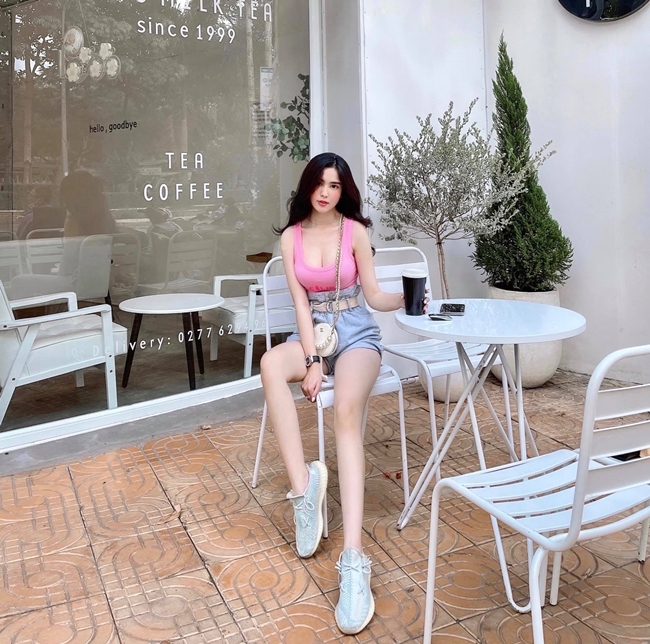 Hot girl Quảng Ninh Dạ thảo chọn mặc quần short cạp cao cùng áo dáng ngắn.