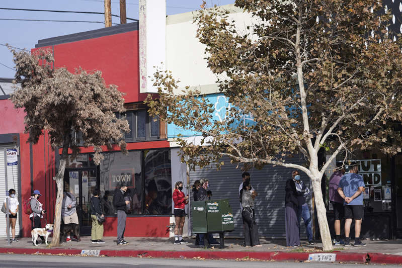 Patrons keep their social distance while waiting for donuts outside Donut Friend bakery in the Highland Park neighborhood of Los Angeles, Saturday, Nov. 6, 2021. A vaccine mandate that is among the strictest in the country takes effect Monday, Nov. 8, in Los Angeles, requiring proof of shots for everyone entering a wide variety of businesses from restaurants to shopping malls and theaters to nail and hair salons. (AP Photo/Damian Dovarganes)© Provided by Associated Press Patrons keep their social distance while waiting for donuts outside Donut Friend bakery in the Highland Park neighborhood of Los Angeles, Saturday, Nov. 6, 2021. A vaccine mandate that is among the strictest in the country takes effect Monday, Nov. 8, in Los Angeles, requiring proof of shots for everyone entering a wide variety of businesses from restaurants to shopping malls and theaters to nail and hair salons. (AP Photo/Damian Dovarganes)