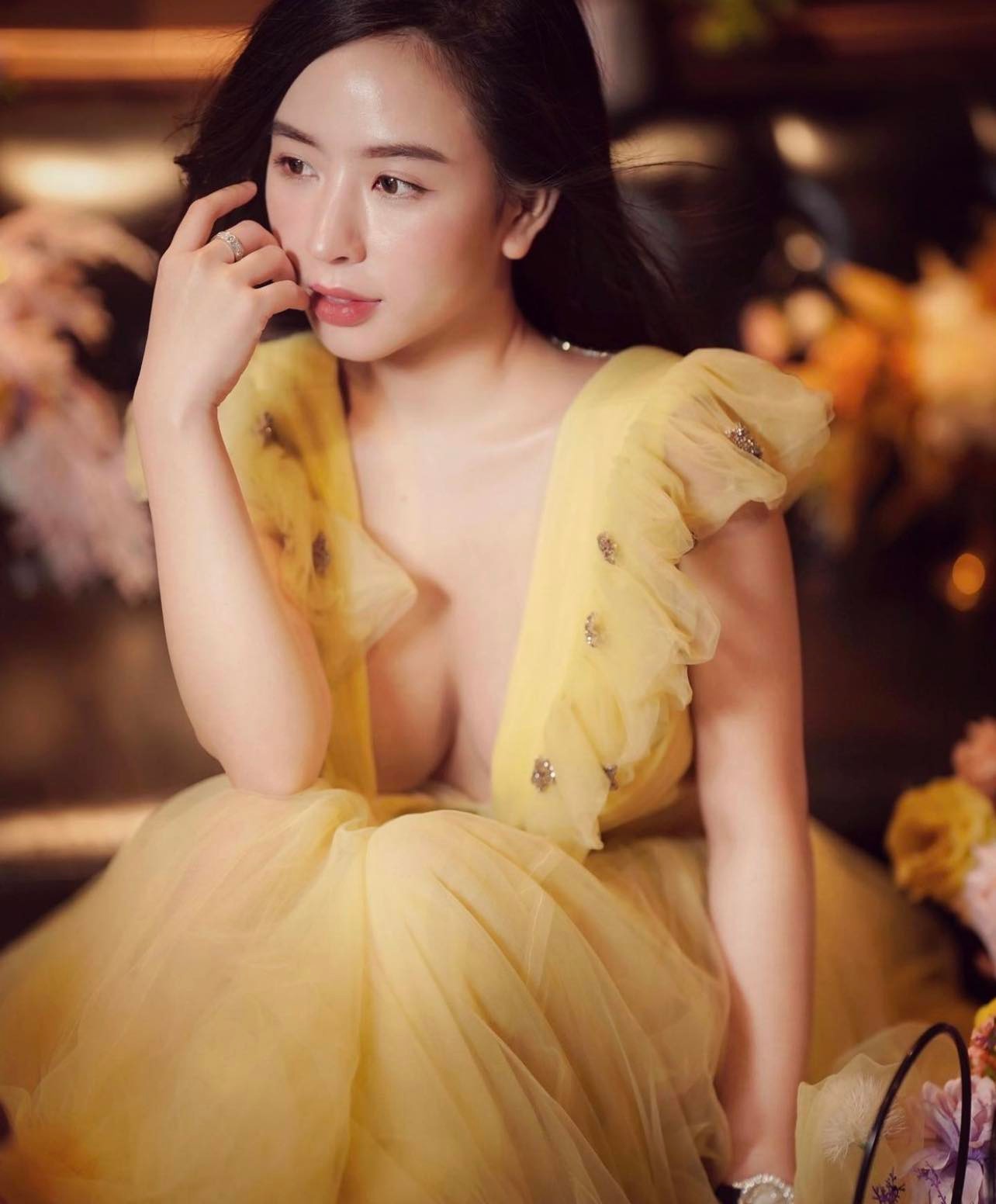 Hot girl Phương Bora mặc váy trễ, khoe vòng một đầy đặn.