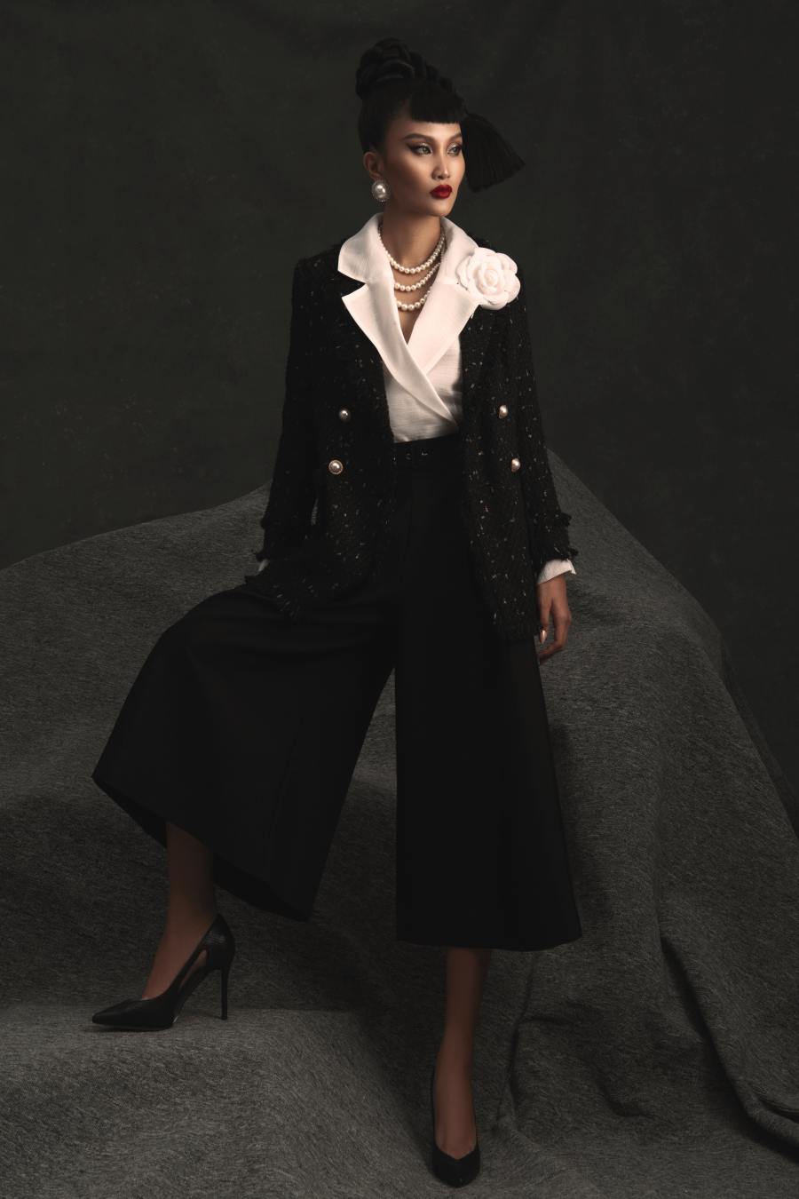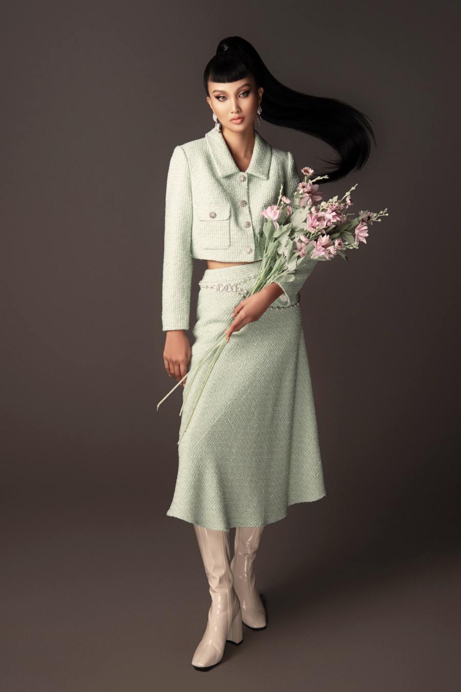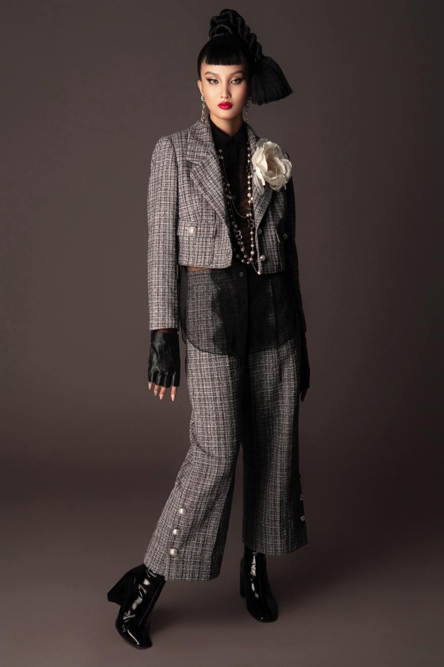 Trong loạt ảnh mới, Tường Vân diện những thiết kế nằm trong BST mới nhất của nhà mốt. Các thiết kế đều được thực hiện trên nền vải tweed, hợp xu hướng trong mùa thời trang Thu - Đông. Anh đặt dệt riêng, với tỉ lệ sợi phù hợp với vùng nhiệt đới.