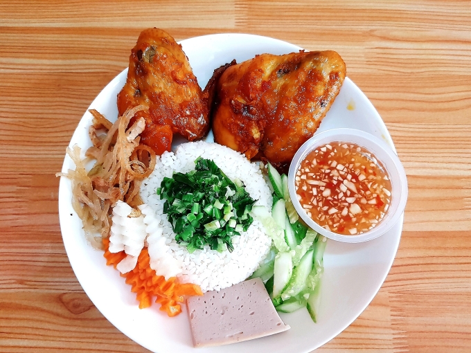 Món cơm tấm cánh gà nướng kết hợp cùng bì, dưa chua và mỡ hành cho bữa ăn đủ chất và không ngán.
