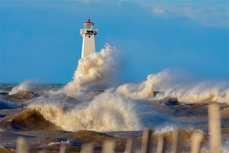 Thời tiết mưa bão trên Hồ Ontario khiến những con sóng ập đến xung quanh Sodus Point Light, ở làng Sodus Point, New York.