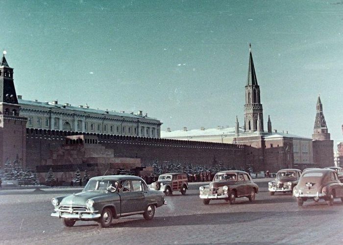 Những chiếc xe hơi Liên Xô sản xuất chạy qua lăng lãnh tụ Lenin ở Quảng trường Đỏ.