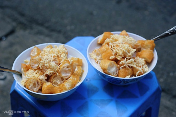 Đây thực chất là một cách biến tấu khác của món bánh đúc truyền thống, thay vì để nguội cắt miếng chấm tương thì bánh đúc được ăn trong lúc vẫn còn đang đun nóng và dẻo quánh. Bánh đúc nóng sẽ ăn kèm nước chấm chua ngọt, thịt xay xào mộc nhĩ, rau mùi tươi xắt nhỏ, hành khô phi vàng và rắc thêm tiêu, ớt bột. Khoảng 15.000 - 20.000 đồng một bát vừa vặn để lót dạ xế chiều. Một số địa chỉ bán bánh đúc nóng đông khách hiện nay nằm ở phố Lê Ngọc Hân, khu tập thể Trung Tự, phố Nguyễn Hiền... Ảnh: Khánh Trần