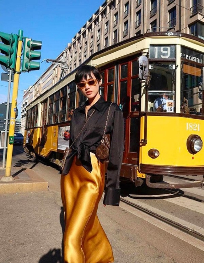 Lụa có chất liệu mỏng, nhẹ lại bóng bẩy một cách tự nhiên nên rất được phái đẹp ưa chuộng. Trâm Anh cũng từng diện kiểu đồ này.