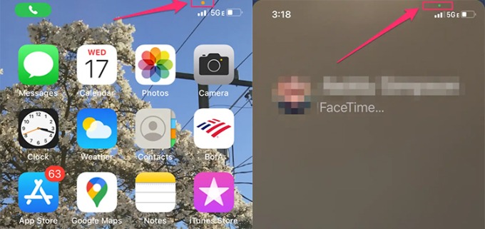 Khi một chấm màu xanh lá xuất hiện ở cùng vị trí, dấu hiệu này cho thấy một ứng dụng đang sử dụng dữ liệu từ camera hoặc đồng thời camera và micro của máy. Ví dụ, khi người dùng mở ứng dụng Instagram và tạo Story hoặc gọi FaceTime, biẻu tượng màu xanh sẽ hiển thị ở góc phải ngay trên biểu tượng mạng di động.
