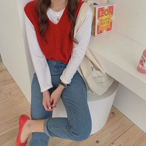 Áo gile đỏ đang được chị em "đua nhau" diện trong mùa đông. Để tạo không khí Tết, nàng chọn áo gile đỏ mix với áo sơ mi hoặc áo giữ nhiệt trắng và chân váy hoặc quần jean giống trong ảnh.