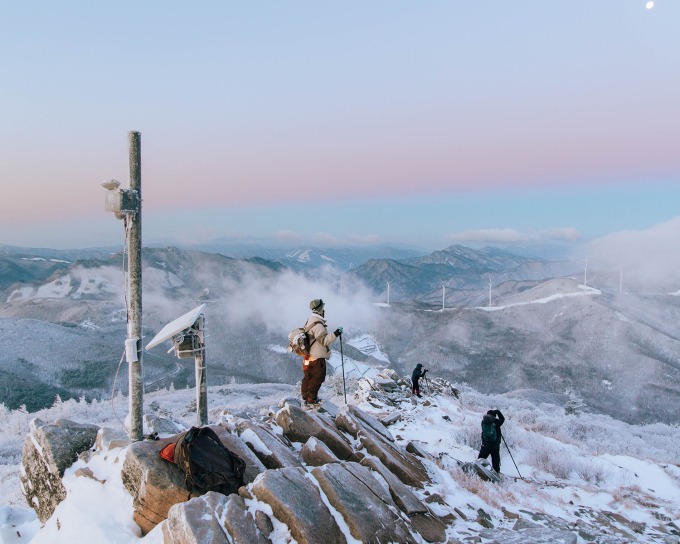 Đức Anh cùng các nhiếp ảnh gia săn ảnh đẹp trên đỉnh nủi tuyết Hambaeksan.