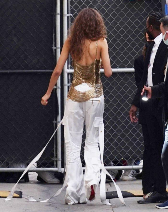 Balmain gần đây ra mắt thiết kế có chi tiết dây đai dài nổi bật. Thay vì phối đồ theo phong cách năng động, Zendaya chọn kết hợp với áo hai dây lấp lánh, mang đến cái nhìn gợi cảm. Ảnh: Star Max.