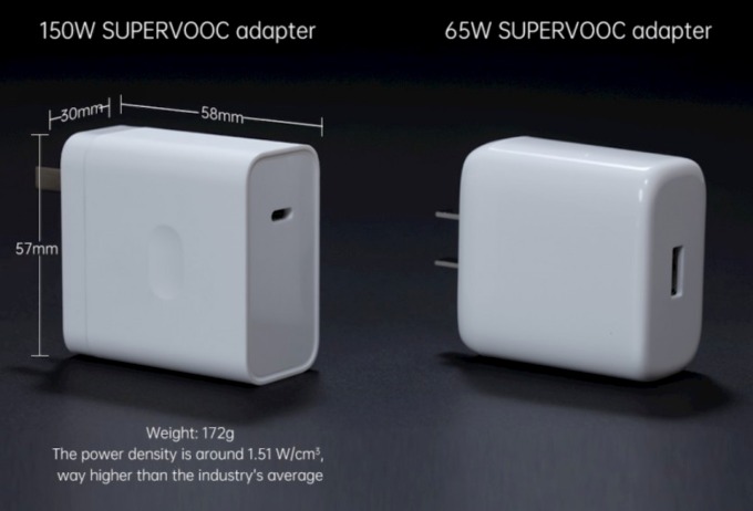 Ngoài sạc 240 W, Oppo còn giới thiệu SuperVOOC công suất 150 W. Nhờ công nghệ GaN, bộ sạc có kích thước 58 x 57 x 30 mm và nặng 172 gram, không lớn hơn nhiều so với sạc SuperVOOC 65 W cũ của Oppo.