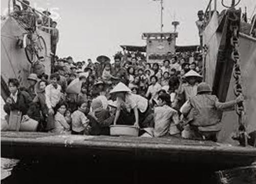 Trên đường tiến đến gần cửa biển, thuyền gặp hai ba chiếc xà lan thật lớn đang thả neo trên sông. Xà lan nào cũng chứa đầy người. Xa hơn về phía cửa biển, một đoàn ba, bốn chiếc tàu hải quân đang đậu ở đó. Người lái thuyền đưa cả gia đình Minh đến một chiếc đầu tàu dùng để kéo xà lan đang đậu, có lẽ vì boong tàu không cao dễ dàng hơn trong việc chuyển người. Trên tàu dày đặc những người và người: đàn ông, đàn bà, trẻ em và có cả quân nhân.