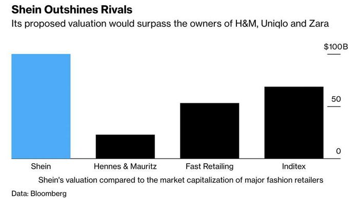 Shein - một công ty bán lẻ trực tuyến các sản phẩm thời trang, mỹ phẩm và sản phẩm phong cách sống – đang đàm phán với các nhà đầu tư tiềm năng, bao gồm General Atlantic, trong một vòng gọi vốn có thể định giá công ty ở mức khoảng 100 tỷ USD, theo hãng tin Bloomberg. Những sản phẩm mà Shein bán đều là những sản phẩm với mức giá mềm, và trang web của công ty này mỗi ngày đưa ra khoảng 6.000 sản phẩm mới.