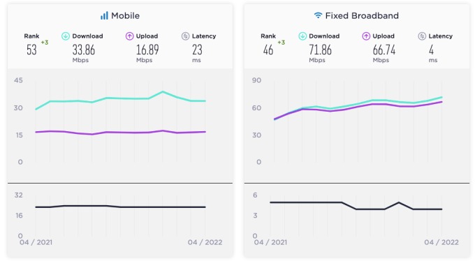 Theo số liệu vừa được Ookla Speedtest công bố, tốc độ Internet của Việt Nam tháng 4 đã tăng ba bậc cả với Internet băng thông rộng cố định, từ 49 lên 46, và Internet di động, từ 56 lên 53, so với tháng 3.