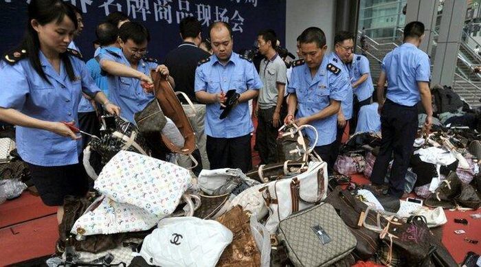 Lực lượng quản lý thị trường Trung Quốc kiểm tra túi xách giả. Ảnh: AP
