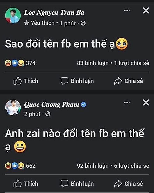 "Anh trai nào đổi tên Facebook em thế ạ", Mạnh Dũng viết trên tài khoản vừa bị đổi tên. Cùng lúc đó, một cầu thủ khác là Phan Tuấn Tài cũng bị đổi thành "Loc Nguyen Tran Ba".