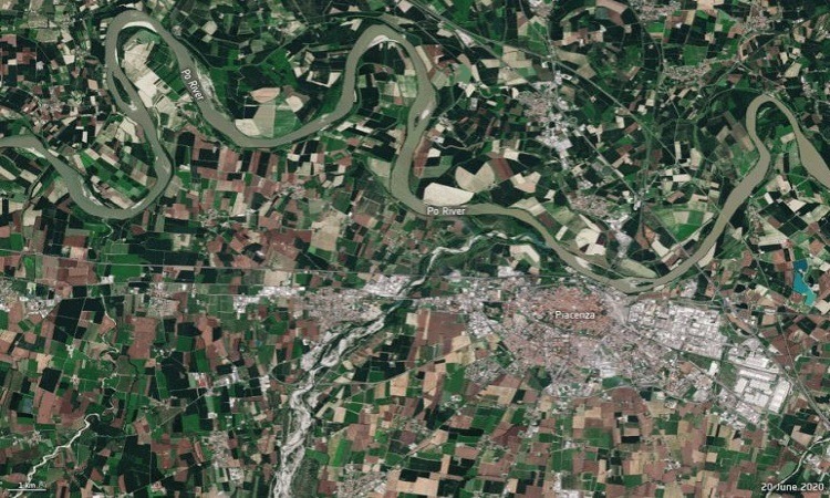Hình ảnh từ vệ tinh Copernicus Sentinel-2 chụp một phần thung lũng Po gần Piacenza (thành phố thuộc tỉnh Emilia-Romagna phía bắc Italy), hé lộ con sông đã thu hẹp đáng kể trong thời gian từ tháng 6/2020 đến tháng 6/2022.