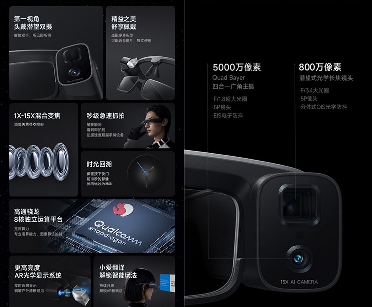 Mijia Glasses Camera nặng 100 gram, cấu hình cao với chip Snapdragon 8 và màn hình OLED do Sony sản xuất.