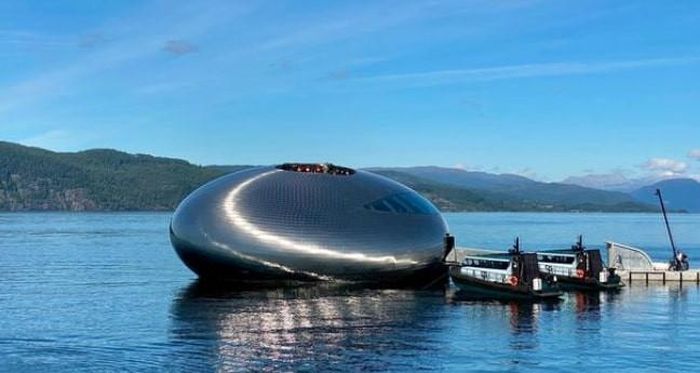 Trước sự ngỡ ngàng của người dân địa phương, một tòa nhà có ngoại hình giống UFO kỳ lạ trôi nổi trên hồ nước Na Uy. Cấu trúc kỳ lạ này được gọi là 'Mắt cá hồi', nằm ở Hardangerfjord, Na Uy, ngay bên ngoài Rosendal.