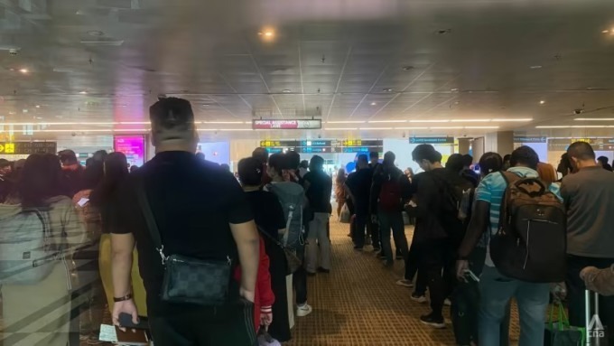 Hành khách xếp hàng tại hải quan Singapore, ngày 31/3. Ảnh: CNA