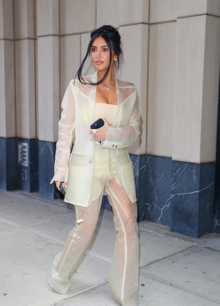 Kim diện một chiếc áo quây ngang, phối cùng blazer và quần ống rộng trong suốt. Mẫu quần xuyên thấu của cô để lộ mọi chi tiết bên trong như túi, khuy, giày cao gót mũi nhọn.