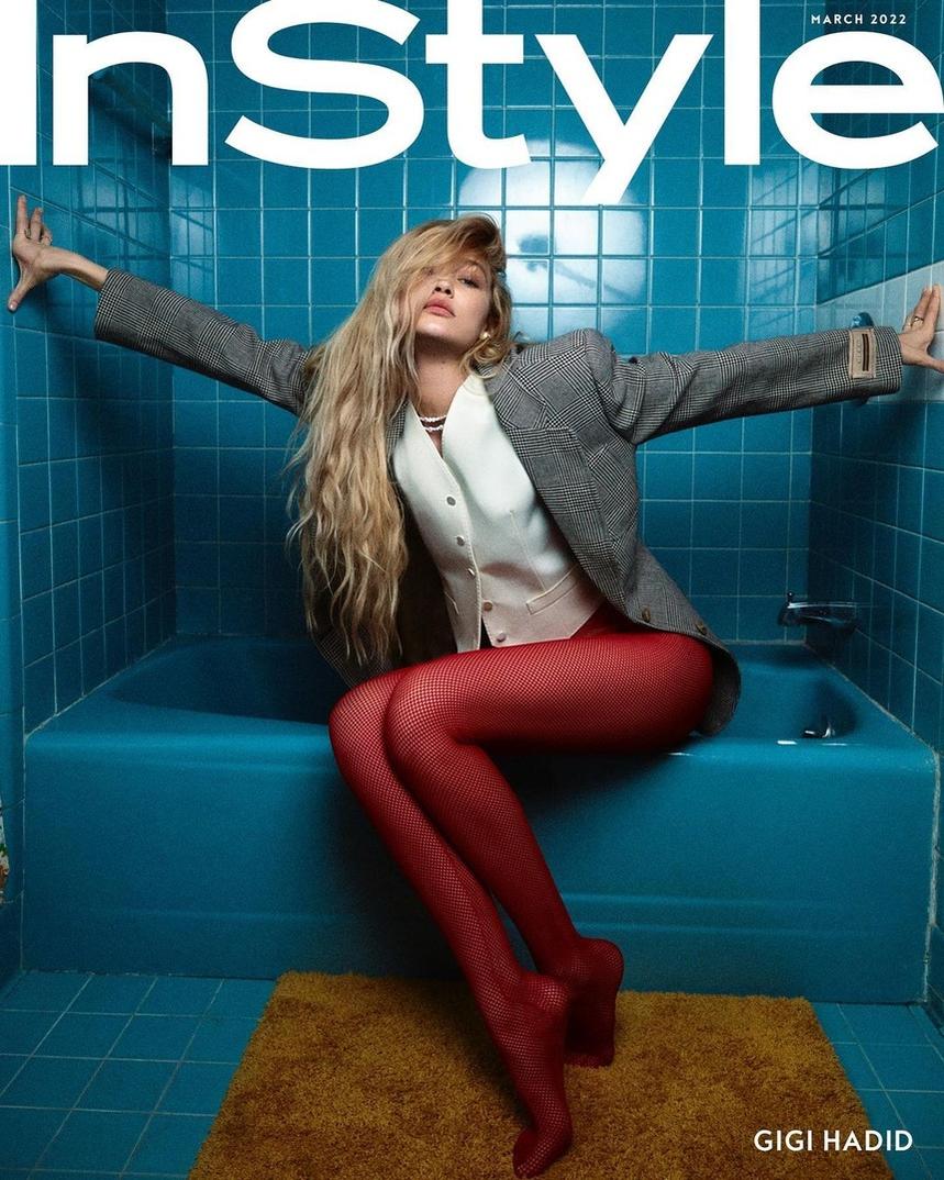 Gigi Hadid mặc blazer cùng quần tất trên bìa tạp chí Instyle. Ảnh: Instyle.