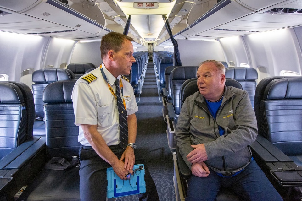Tom Stuker nói chuyện với cơ trưởng Kevin McDermott của United Airlines trước khi cất cánh từ Buffalo.