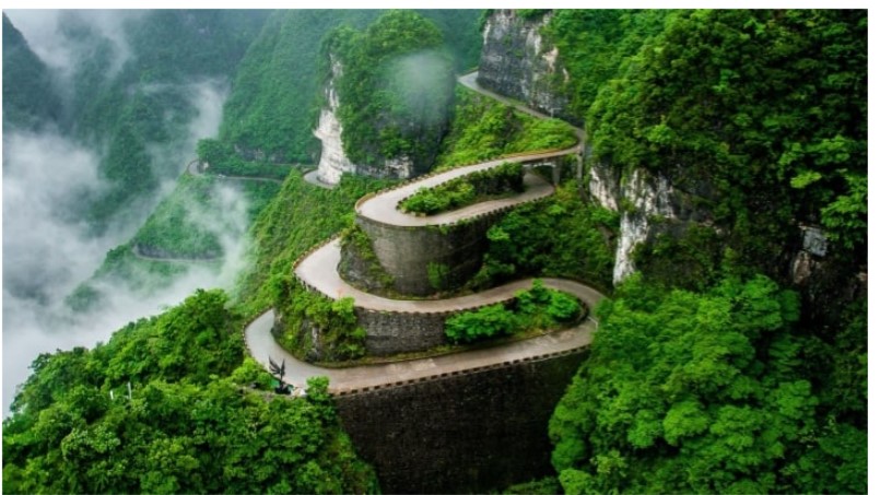 Một trong những đỉnh núi nổi tiếng ở Trung Quốc phải kể đến Thiên Môn Sơn - nơi có cung đường với 99 khúc cua hiểm trở dẫn tới điểm đích được gọi là "cổng trời".