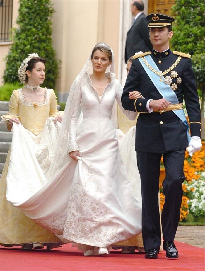 1. Váy cưới của Hoàng hậu Letizia (năm 2004). Đám cưới của Vua Felipe VI và Hoàng hậu Letizia nổi bật với chiếc váy cưới màu trắng thêu bằng vàng thật. Được thiết kế bởi thợ may Manuel Pertegaz (Tây Ban Nha), chiếc váy có trị giá khoảng 8 triệu USD. Theo The Express Tribune, đây là chiếc váy cưới đắt nhất trong lịch sử hoàng gia thế giới tính đến hiện tại.