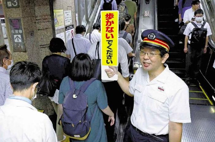 Nhân viên nhà ga cầm biển báo khuyến cáo hành khách đi an toàn trên thang cuốn. Ảnh: Japan News