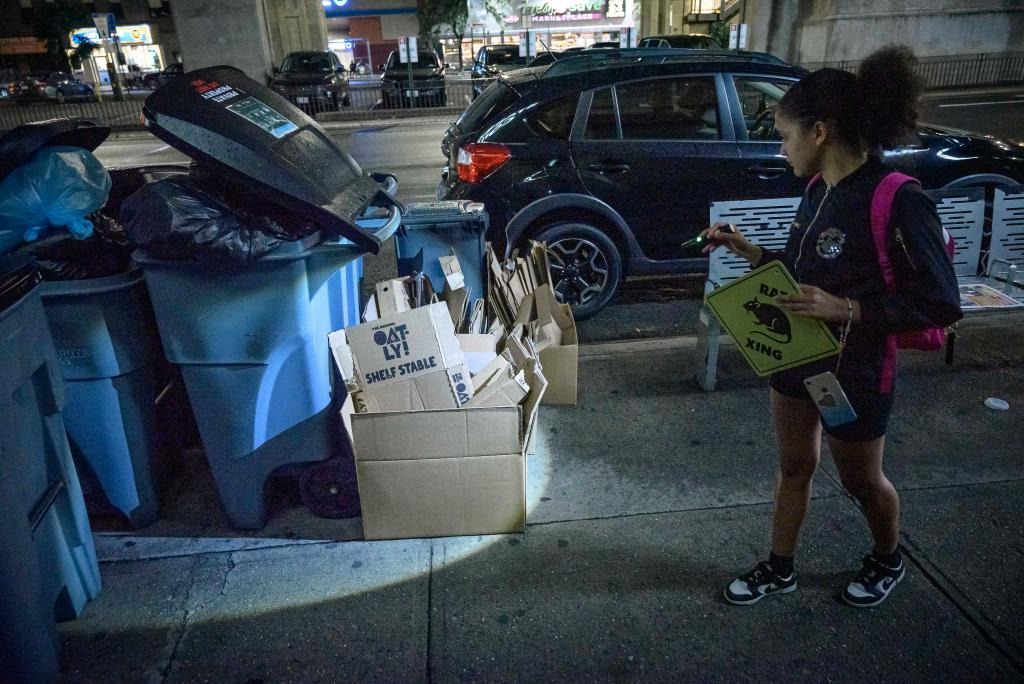 Cô Noelia Guzman quan sát khu vực tập kết rác ở Sunnyside, Queens. Cô tìm kiếm những con chuột đang mò ăn trong đống rác.