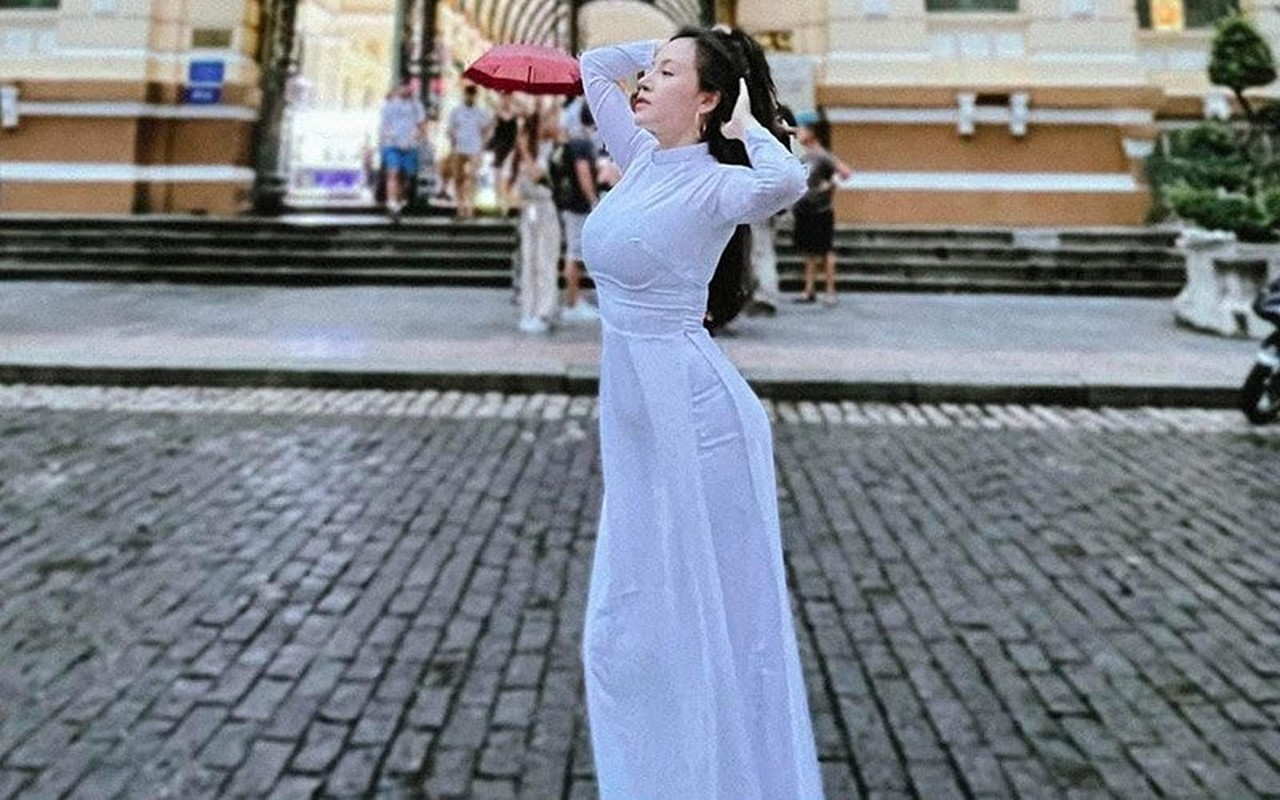 Khoảnh khắc hot girl bà Tưng thả dáng với áo dài thướt tha được người qua đường chú ý. Đây là tà áo dài trắng đồng phục mà bao thế hệ nữ sinh của Việt Nam đều quen thuộc.