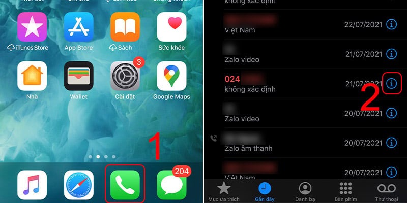 Với cách chặn cuộc gọi ngoài danh bạ trên iPhone theo từng số, đầu tiên bạn hãy truy cập vào ứng dụng cuộc gọi trên giao diện màn hình chính. Tiếp theo, hãy nhấn vào mục gần đây để xem lại cuộc gọi rồi chọn số điện thoại bạn muốn chặn. Khi đó, bạn sẽ nhìn thấy biểu tượng chữ (i) bên phải số điện thoại muốn chặn, chỉ cần kéo xuống dưới rồi xác nhận chặn liên hệ là xong.