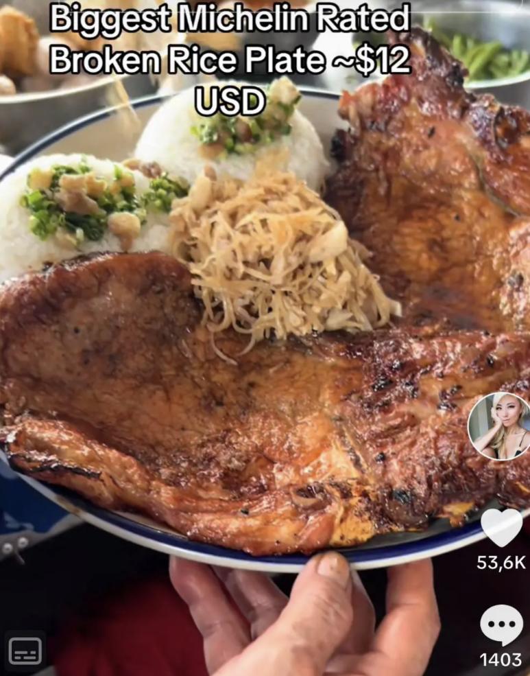 Một đoạn clip đang lên xu hướng trên TikTok về đĩa cơm tấm ở TP. Hồ Chí Minh do vị khách nước ngoài trải nghiệm tại hàng cơm tấm được Michelin xếp vào danh sách quán ăn bình dân có giá cả phải chăng (Bib Gourmand).